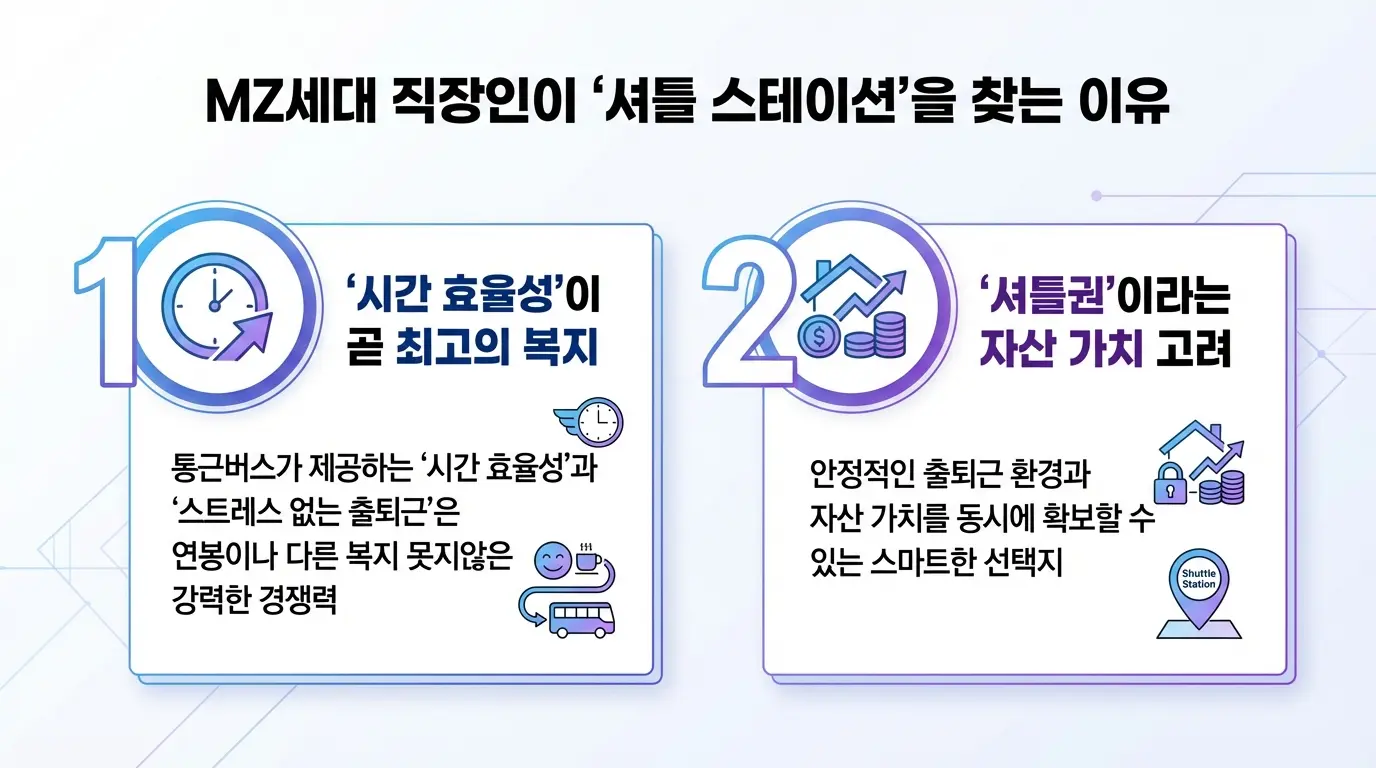 이처럼 MZ세대 직장인에게는 회사까지의 물리적 거리보다, 출퇴근 과정에서 느끼는 피로도를 낮추는 '심리적 거리'가 주거지를 선택하는 기준이 되었습니다. 통근버스가 제공하는 '시간 효율성'과 '스트레스 없는 출퇴근'은 연봉이나 다른 복지 못지않은 강력한 경쟁력으로 자리 잡았습니다.